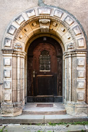 An elaborate arched doorway serves as the entrance to a home across from the Church of our Lady in Meissen, Germany.