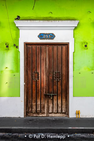 A wooden door, framed in white, is surrounded by a bright green wall on Calle de San Jose (San Jose Street) in San Juan, Puerto Rico.