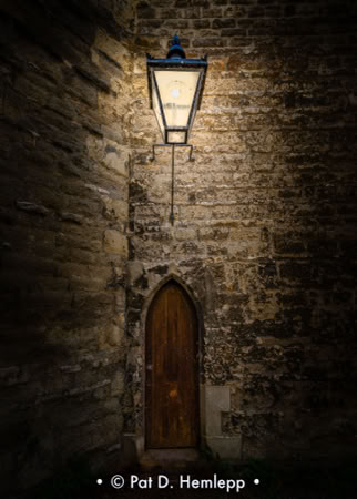 A large light hangs over the ancient, small back door of St. Edmund Hall Library on Queen's Lane in Oxford, England.