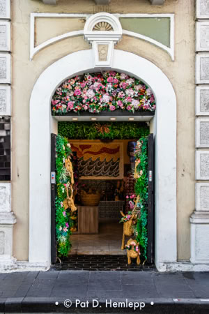 An entry to a shop on Calle de San Jose (San Jose Street) in San Juan, Puerto Rico, is decorated with flowers.