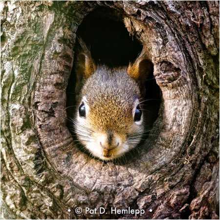 An American red squirrel looks from a knothole, Sharon Woods Metro Park, Westerville, Ohio.