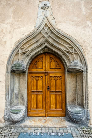 An elaborate arched doorway serves as the entrance to a home across from the Church of our Lady in Meissen, Germany.