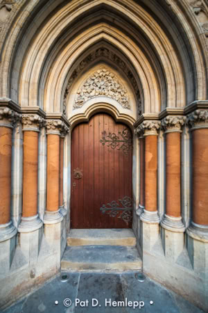 Columns and arches surround a door at the Wesley Memorial Methodist Church on New Inn Hall Street in Oxford, England.