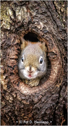 An American red squirrel looks from a knothole, Sharon Woods Metro Park, Westerville, Ohio.