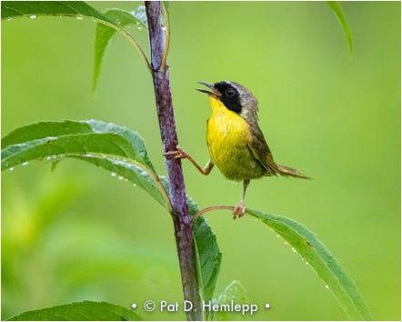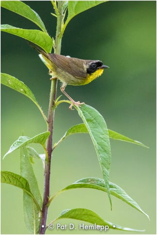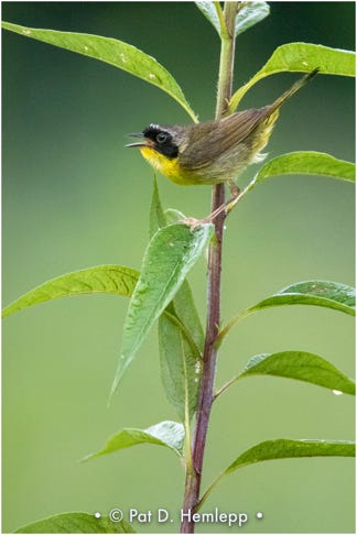 A male Common Yellowthroat sings from a plant in Sharon Woods Metro Park, Westerville, Ohio.