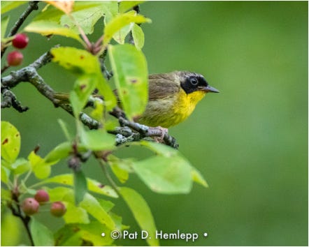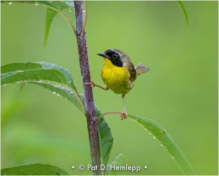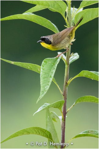 A male Common Yellowthroat grips a plant with a split stance in Sharon Woods Metro Park, Westerville, Ohio.
