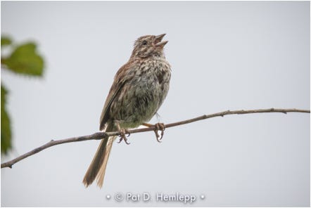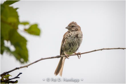 A Song Sparrow perches against an overcast sky in Sharon Woods Metro Park, Westerville, Ohio.