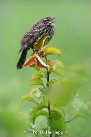 A female Red-winged Blackbird calls from a plant in Sharon Woods Metro Park, Westerville, Ohio.